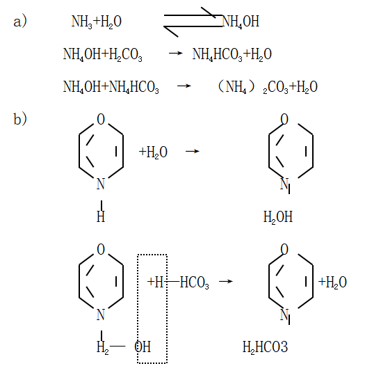 考虑到氨水的Kd较高,在蒸汽初凝时“液相”的含量较低而导致其pH值偏低,故本公司采用有机胺按一定比例混合配比,来解决因此而造成的弊端,并在高压锅炉多年的实际应用中获得较满意的效果。